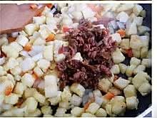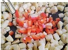 加红椒丁、洋葱丁和金枪鱼,少许盐,翻炒1分钟即可。