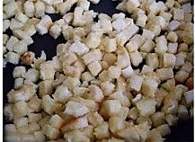 平底锅置火上,多放点油,5成热。放入裹上蛋液的馒头丁