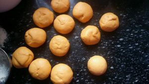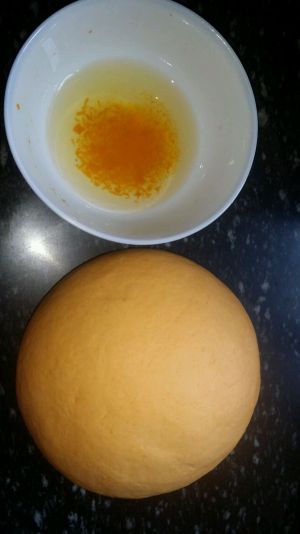 南瓜泥 温热时加酵母 加高筋粉 揉成面团