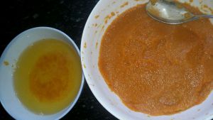 挤出南瓜水备用,南瓜压成泥放凉到手温加入酵母拌匀
