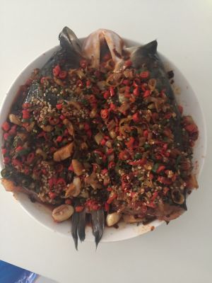 鱼头洗干净控干水 肉多的话划几刀 先在里面一面撒上黄酒 盐 海鲜酱油 胡椒老干妈 翻一面 一样撒上黄酒 盐 海鲜酱油 胡椒 老干妈 盘子下面放上几块生姜和葱段 放自己半小时。随后把尖椒(3个)小红椒(十几二十个)小剁椒(十几二十个)我的鱼头比较大 可以根据实际情况放多少 加上蒜 生姜 一起爆炒 加点盐(一点就行)黄酒 老抽 生抽 小泡椒里的水多倒一些进去 然后翻炒两下 均匀的铲在鱼头上面 (汤不要太多了、蒸的时候鱼也会有很多水分出来)上锅大火5分钟 中小火15分钟 搞定 完美