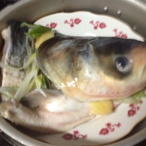 葱姜切大片蒜拍碎.塞鱼身上.装盘上高压锅大火10分钟(先把高压锅加水在火上预热放鱼)
