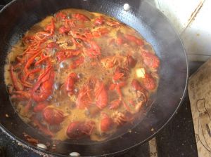 烧油,爆姜蒜末干辣椒,加桂皮八角香叶,拌一下,放虾,加料酒,生抽,翻炒五分钟,加骨头汤。