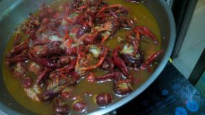 第三步把龙虾放进锅里跟刚炒的一起翻炒然后放些盐(多少看个人口味)炒的差不多,把调好的酱油(用小碗放点酱油,生抽,鸡精加入一点水调和)倒入锅里翻炒下然后放水,焖煮,水差不多就放入尖椒,青大蒜,芹菜炒熟,然后放些十三香。 备注(水差不多就是炒熟这些配菜还剩下一些汤汁)