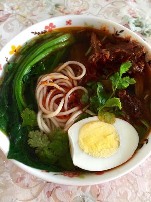 清水烫青菜捞出,取一大碗,碗底撒胡椒粉盐香菜两滴香油,另起锅用牛肉汤煮面至面断生,连汤带面一起倒入碗中,加青菜白煮蛋一点香菜叶和牛肉酱,咸度自己掌握,喜欢辣可以再加辣椒或麻椒。拌匀开吃不要犹豫~