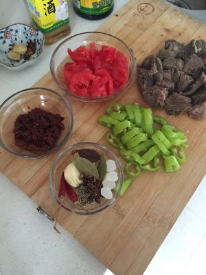 牛肉捞出,放凉切块,切好青椒番茄,拍好大蒜。冷锅冷油,放入一粒八角,几粒花椒,一个干辣椒,油热后把作料捞出不要,关火让油冷十几秒钟,放入冰糖开小火炒化,放入豆瓣酱,小火翻两下,注意别被溅出的油烫着,倒入几粒大蒜两片姜片,炒香后倒入番茄小火炒烂,倒入牛肉块和青椒,加适量生抽适量老抽,颜色轻重自己喜欢就可以了,加入牛肉汤,如果牛肉汤不多的话加水也行,没过牛肉加一点五香粉稍微煮一下,煮成图片那样就成,加一点鸡精出锅。