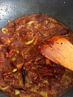 4.捞出肉滤干水,锅开下姜片炒香再把肉翻炒一会加生抽,蚝油,胡椒粉,盐,再加上水焖40分钟(看肉大小),为了方便孩子吃我切的比较小,炖的时间就不用那么久,尝试一下差不多软烂就可以加黄糖片,小米辣,等糖融化之后就可以收汁了