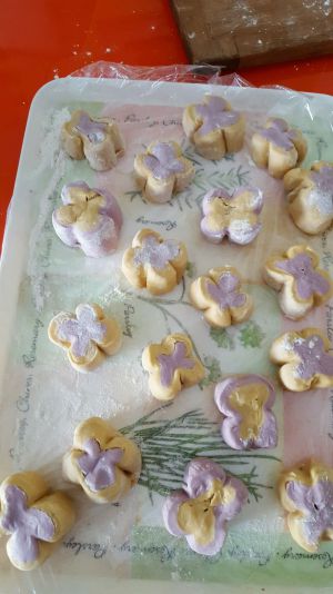 牛奶煮温,用50克牛奶加入2克酵母融化,然后倒入南瓜泥中搅拌均匀。然后加入200克面粉揉成光滑面团。揉好后我是放面包机里发酵的,因为气温低的问题。 然后再用100克温牛奶加入2克酵母融化后倒入紫薯泥里,搅拌均匀,然后再倒入面粉,不要一下子倒完哈,紫薯水份比较少。我最后还剩下30克面粉没倒。如果一下子倒完面团比较硬的话还可以再加点牛奶继续揉。 紫薯面团揉好后用保鲜膜盖好,把盘子放在大概40度的温水里发酵。因为面包机只能发酵一个面团,第二个面团我就用温水发酵