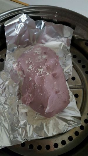 剩下的就做个双色馒头卷,剩下的大面团分别擀开。擀薄。忘记拍图片了。 然后把紫薯放在南瓜上卷起来,收口的时候用点凉水蘸一下口就粘住了