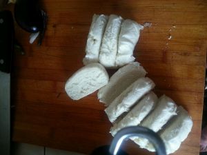 发酵好的面团揉搓排气,搓成长条,分割成十等份。