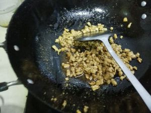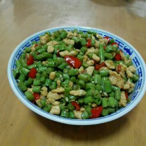 锅内留余油,下蒜末煸香,加入豆角末大火翻炒,加入红椒丁炒匀加盐,一点水,盖盖焖2分钟,然后下入肉丁炒几下,加生抽、醋、一点白糖,少许味精翻匀关火。