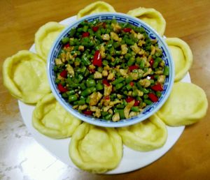 做法2:豆角炒肉丁配窝头和玉米面小馒头