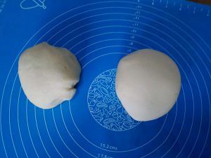 另外一份面粉和成白色面团。将和好的两色面团放在不同的容器中盖上湿润的屉布,温暖处分别发酵。