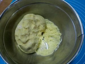 面粉中放入南瓜泥,酵母水揉成光滑的面团。