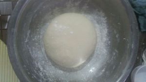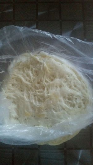 看这是和好的面团,可以软一点,但不能太稀,然后就是放在温暖的地方,让它慢慢发酵吧,大概得四个小时,根据面困情况调整时间。当面团发到约两倍大的时候就可以了。不要怕粘手,我用了大约半碗的面去揉面,不能太多了,只要不太粘手就好。