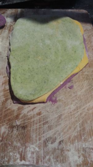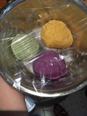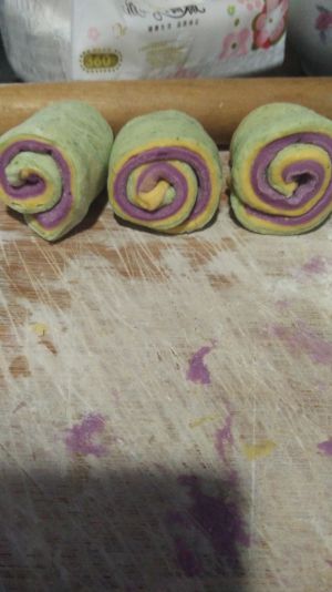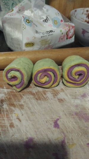 加点白糖 酵母冲温水加进去 还有面粉 。 分成3个颜色 面粉分成三份