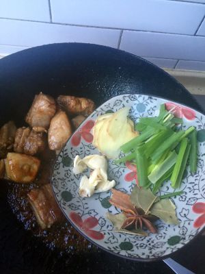 煮好了糖就把排骨直接放进去,加姜,料酒,然后加适当的水炖排骨,这时可以加点酱油和蚝油。等炖的差不多了就可以看出糖浆的颜色上色了。等水炖少了就完成了。今天第一次做就成功了,大家可以试试。