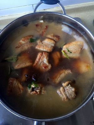 倒入开水,不要凉水,那样的肉不好吃,放开水末过排骨,放酱油,中火炖,汁都收进去后,肉也熟了,放盐,就可以出锅啦~