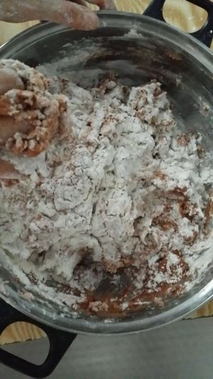 把搅拌了酵母粉的温水倒入面粉里,用筷子搅拌,直到水分吸收在面粉里,呈现疙瘩状态,下手揉面团,整盆面粉揉成一团。
