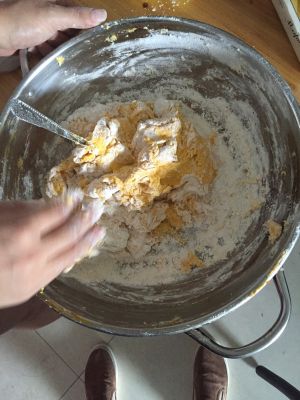 搅拌成无干粉的面絮(面粉的吸水性不同,要是太干可以适量少加点水)