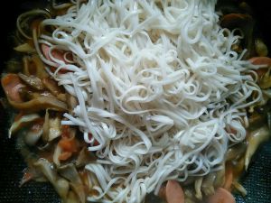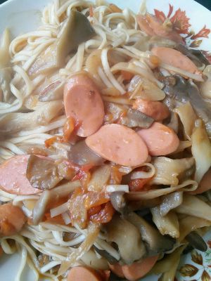 食材:芦笋、猪肉丝、洋葱、酱油、面条