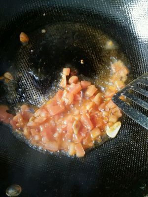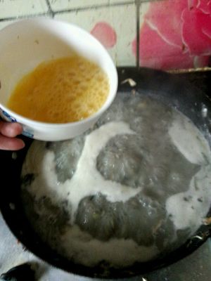 倒入开水,把成坨的茄子一定要搅和碎。煮七八分钟。然后倒入打撒的鸡蛋