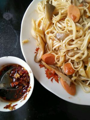 锅内放少许油,依次加入葱绿,青椒,榨菜,紫甘蓝,面条翻炒均匀!自制辣酱翻炒时也可倒入,本人喜欢吃辣辣辣(⊙o⊙)哦!然后加一勺鸡精翻炒出锅~