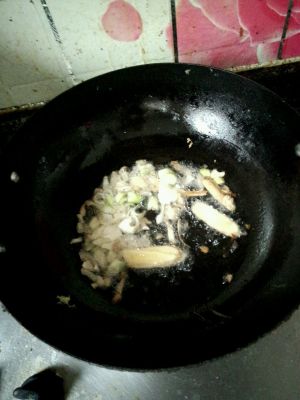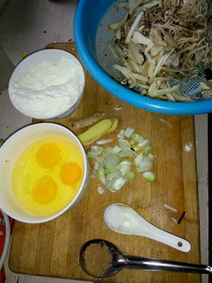 准备材料齐全。茄子切丝,葱花姜丁,盐,花椒面,面粉一小碗,鸡蛋三个。(我不爱吃姜,所以切的大片方便出锅时捞出。喜欢姜的可以切成丁末。)