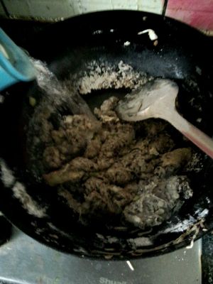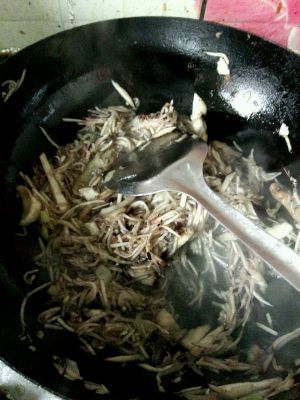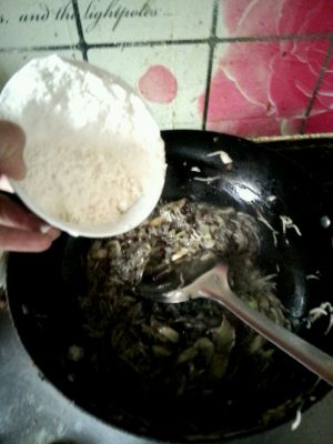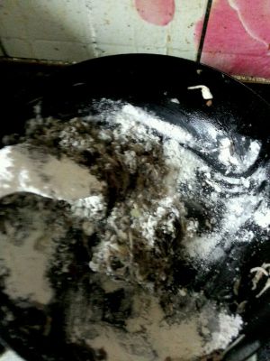 翻炒两三分钟茄子变软,加入盐翻炒,再加入花椒面翻炒(也可以用饺子料或者十三香粉代替花椒面)。翻炒到茄子都熟了软踏踏的了。 就倒入面粉快速频繁翻炒,别糊锅。