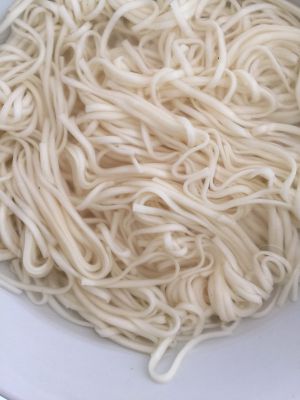 将煮好的面条捞出放入冷开水中,放凉沥干后加入少量食用油搅拌。