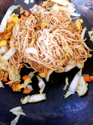 6) 炒香后放入煎好的面条,倒入生抽,老抽和香油调味,翻炒均匀即可。