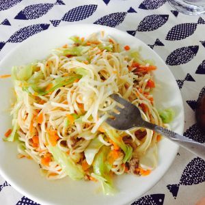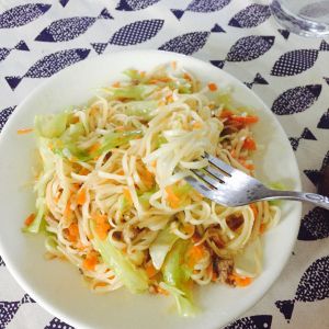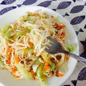 将冷却后的面条放入锅中一起中火或者小火炒,觉得油少粘锅,可以再适量加入橄榄油