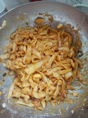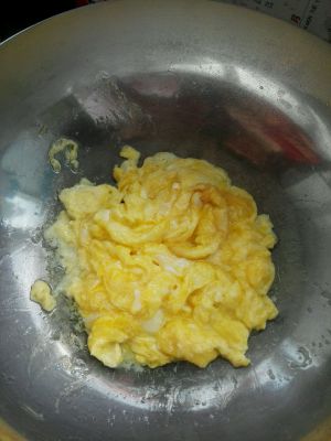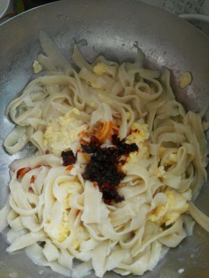 鸡蛋熟了以后放入面和老干妈、老抽,不停翻炒,直到都上好色