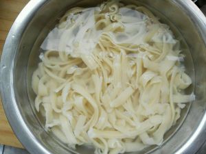 意面入水煮熟,然后凉水过一下,用冰块镇一镇。晾干,用少量植物油拌一下,待用。