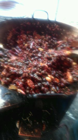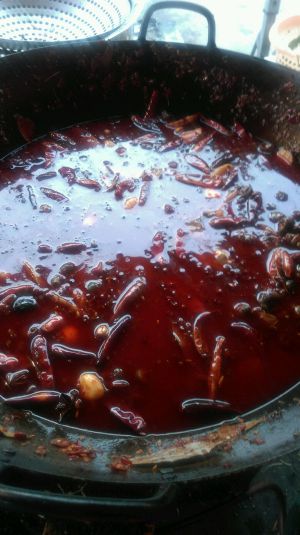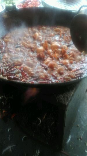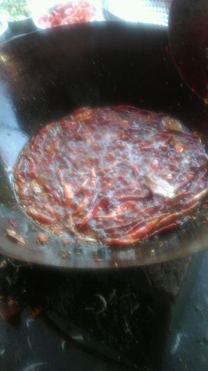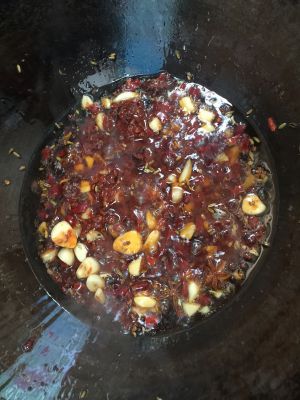 锅烧热倒入适量的油,加入花椒,辣椒,八角,小茴香籽,蒜瓣,生姜,豆瓣酱煸炒出香味