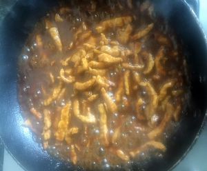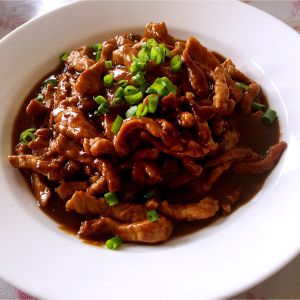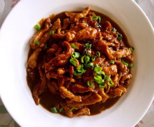 小火余油中加入甜面酱,料酒,少量生抽,鸡精,少量糖。炒匀。倒入肉丝翻炒上色。收汁。盛盘。