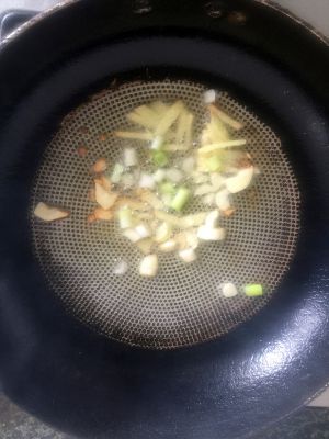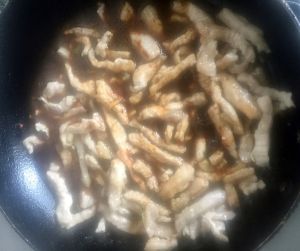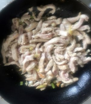 热锅下油(油稍微多点)。四分热时下腌制好的肉丝划炒。肉丝变白盛盘备用。