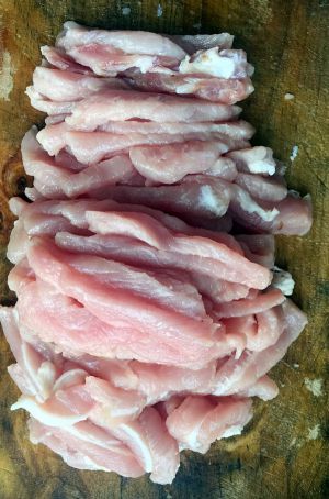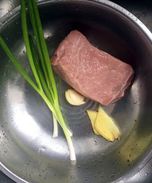 将猪里脊肉洗净切丝,小葱洗净切段(长度按个各家的盘子来决定,是铺底用的。)