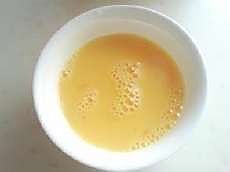 腌好的苦瓜过水冲洗一下,否者会咸。三个蛋磕入汤碗搅散,加入苦瓜、小葱拌匀。