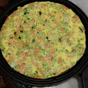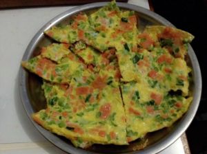 锅中放油,待油温后调小火倒入蛋液和苦瓜并用铲子把苦瓜蛋向四周抹匀抹开。中间轻晃几次锅。