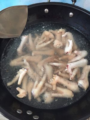 锅里放入水,姜片,料酒适量烧开,放入鸡爪焯水20分钟左右