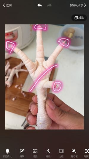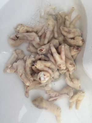 鸡爪洗净,把指甲盖剁了,不剁也行,然后一分两半一个鸡爪