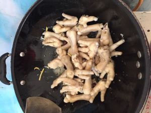 然后放入鸡爪炒至表面微黄,鸡爪有水会溅出来,要注意安全