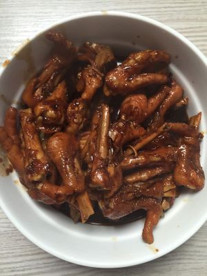 然后依次放入生抽,老抽冰糖炒至上色后加入适量热水末过鸡爪,放入姜片,葱段,香叶,适量盐,适量陈醋,大火煮开后转小火慢慢焖烧30-40分钟左右