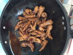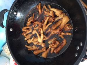 冰糖化开(起泡),放入鸡爪,均匀炒上色。
