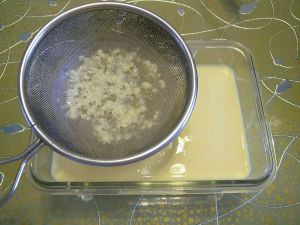 取一保鲜盒,将蛋挞水过筛,这样做出来的蛋挞会非常嫩滑。