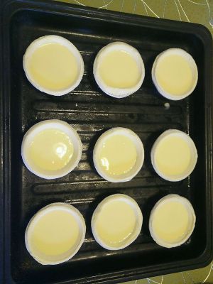 将蛋挞液放入蛋挞皮中八分满就好(烤的过程中膨胀)烤箱先预热一会,以防蛋液被蛋挞皮吸收蛋挞皮不脆