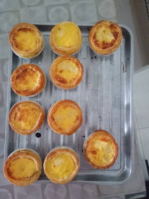 冰箱取出蛋挞皮,我是用的高贝蛋挞皮,加挞水七八分满,入烤箱200度20分钟,隔烤箱观察挞液涨高后又回落,挞皮上色,然后取出一个倒出看底部上色,Ok了。