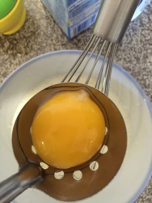 稍凉后放入一个蛋黄拌匀,我喜欢用吃火锅的漏勺分蛋黄,很方便。其实放全蛋也可以,口感没什么差别.