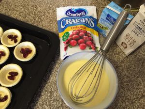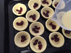 蔓越梅放入解冻后的蛋挞皮里,倒入蛋液。